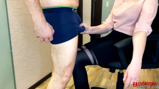Blonde mistress fingering slave's cock